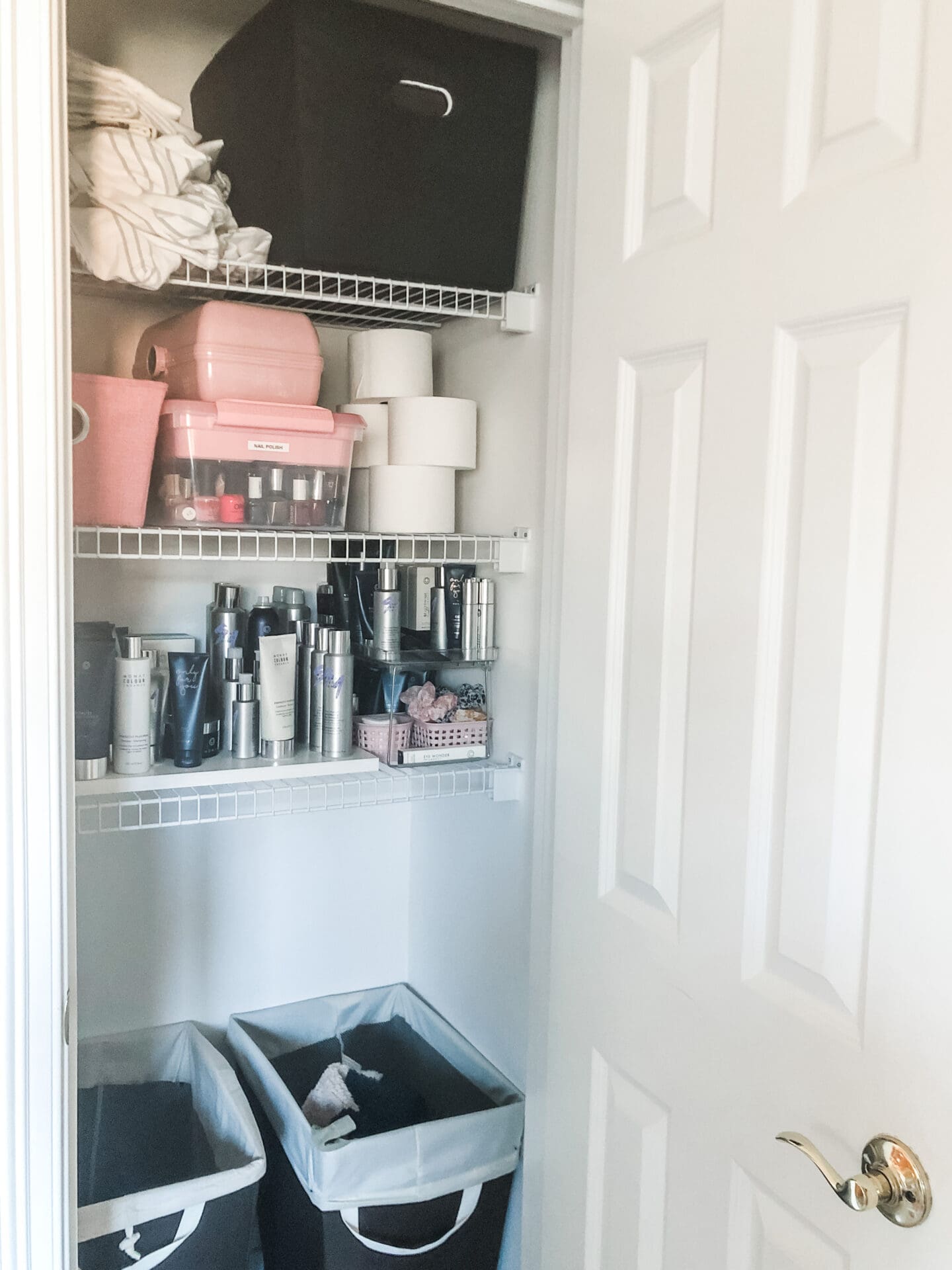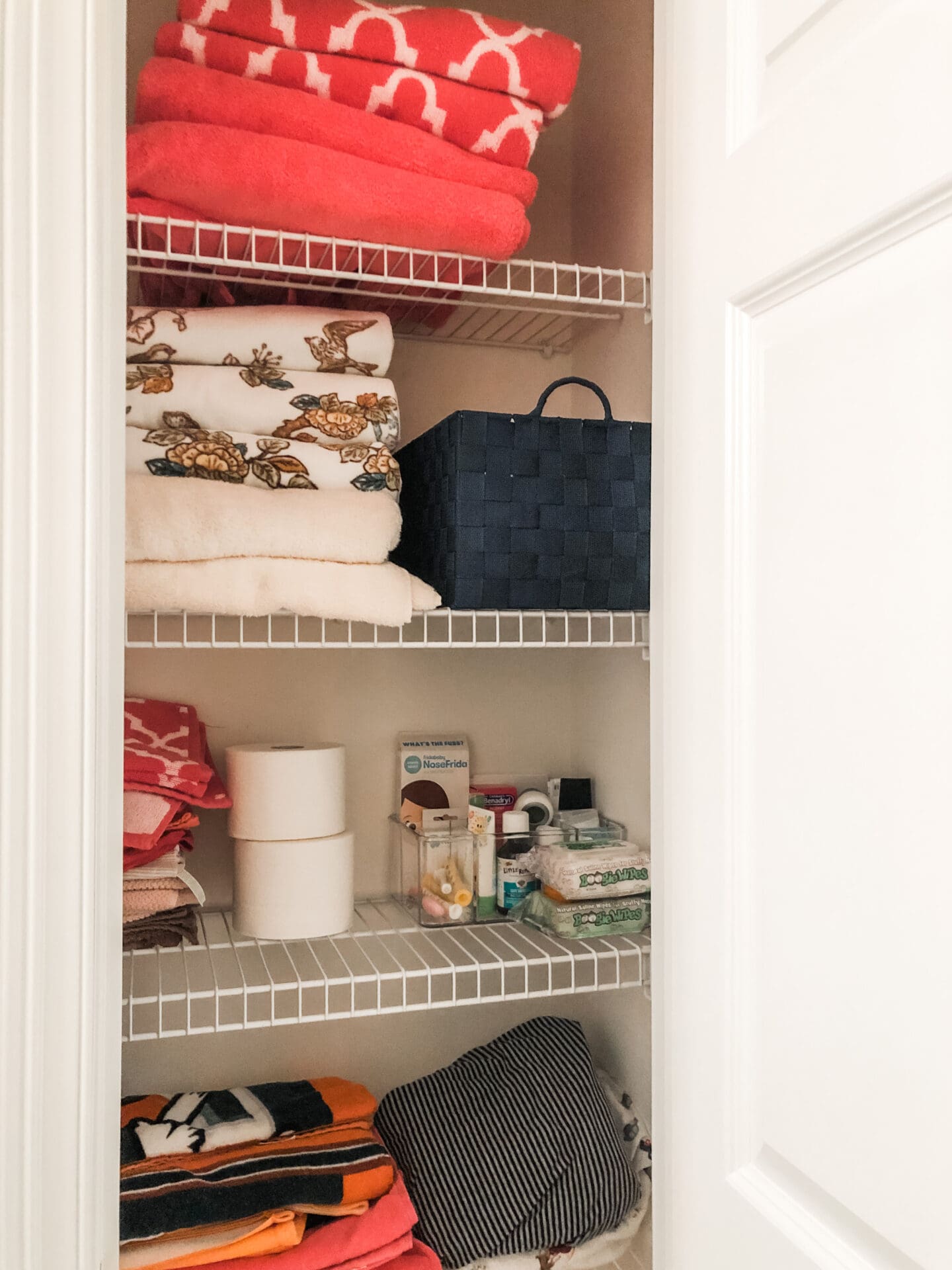 6. Store laundry baskets in there – if possible I keep laundry baskets in the linen closet so the door can be shut and it’s all tucked away. If it’s more practical for you to keep it somewhere else though (like we have Leyton’s next to his changing table) then by all means do that.