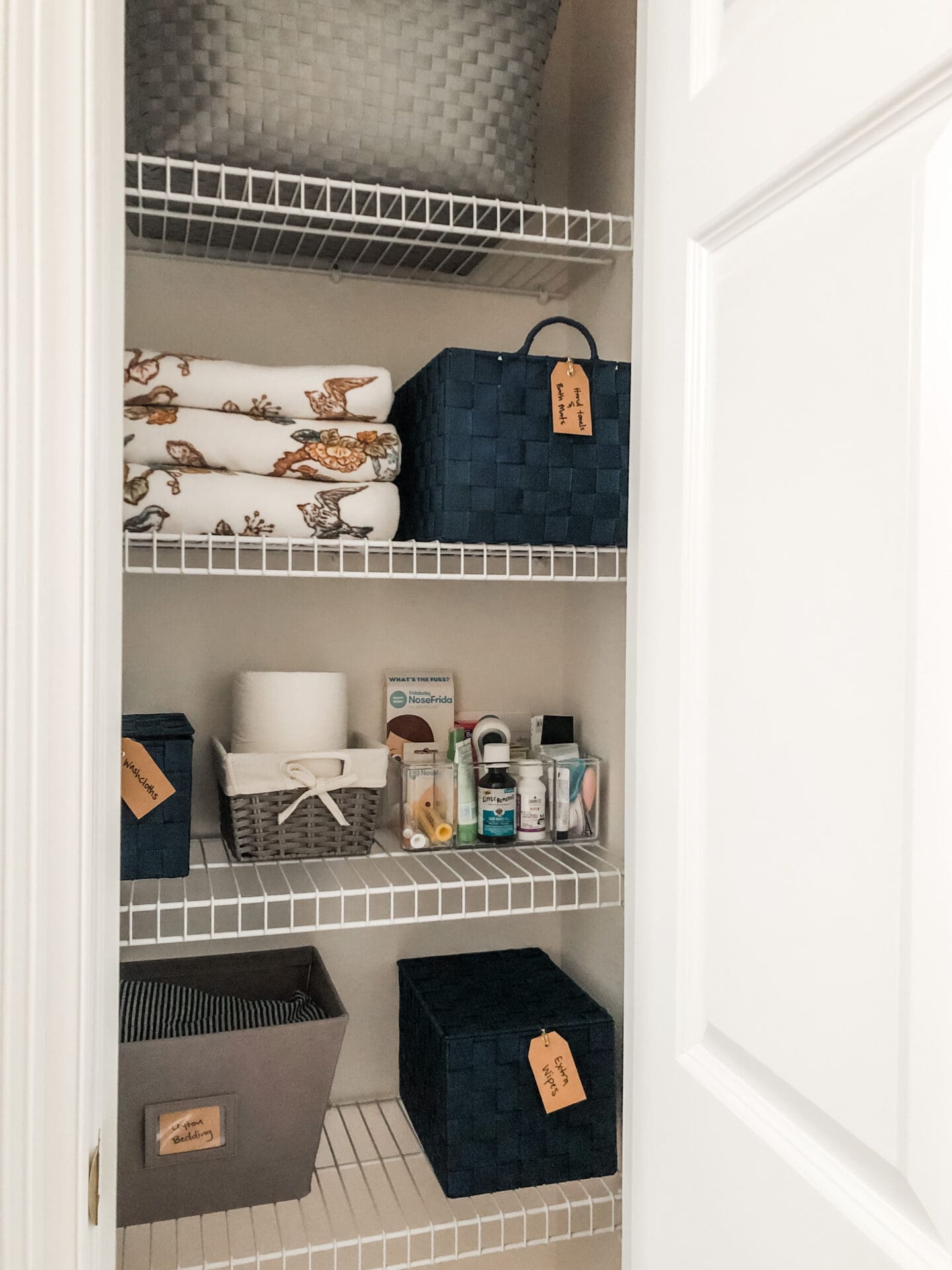 Next up in how to organize the linen closet, we are heading upstairs to the one that serves both the guest room and Leyton’s room. Since it’s primarily Leyton’s currently, I went with a blue and gray color scheme. The same rules still apply here.