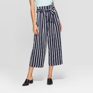 Striped Crew Neck Sweater (have this in the blue and white with pink trim) // Striped Wide-Leg Cropped Pants // Navy Plaid Shirt // Sleeveless V-Neck Jumpsuit // Waist Shorts with Bow // Camo Sweatshirt