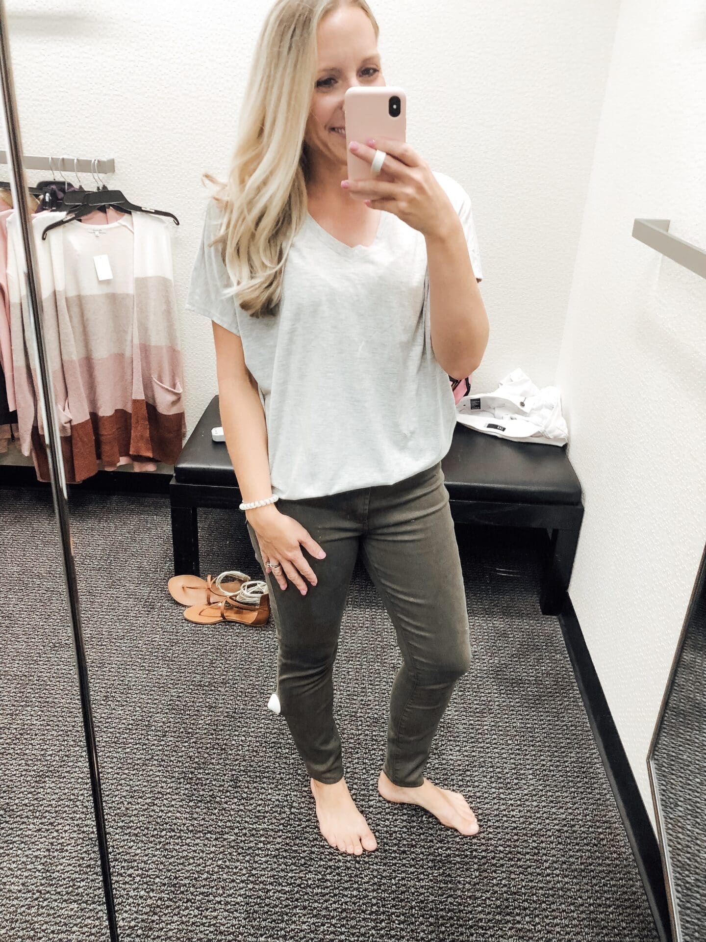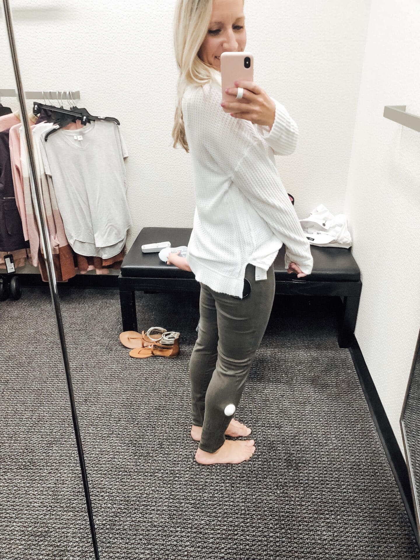 I loved this top paired with these olive green jeans, which I also didn’t think I’d like but ended up loving and found they went with so many pieces from the sale. They are by Articles of Society and I just love the green color. They fit true to size. The only bummer is that the pockets aren’t real in the front but I loved these so much that that didn’t bother me enough to not buy them.